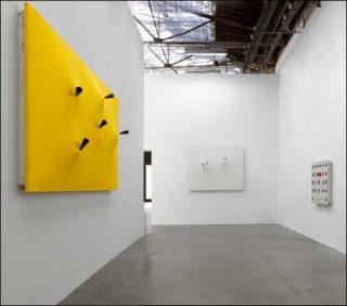 La seconde installation de l’exposition illustre tout à fait ce programme. Des projectiles métalliques attachés à des câbles demeurent suspendus dans le vide, à quelques centimètres à peine d’aimant fixés sur les murs, qui les attirent irrésistiblement. La force d’attraction rapprochant les objets fascine ainsi Takis. Dès lors, l’artiste s’emploie à faire communiquer divers types d’objets, comme dans les Télépeintures, où un aimant caché derrière un monochrome attise un cône métallique ou une maquette de satellite.