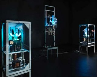 Enfin, Takis se révèle parfois comme un véritable savant fou, se lançant dans les pires expérimentations. Télélumières émet des éclats bleus via d’énormes ampoules dans lesquelles se produisent d’inquiétantes combustions. Le siècle de Kafka, œuvre créée en 1984 à la demande du Centre Pompidou, met en scène un laboratoire sordide, digne de l’univers de Frankenstein.