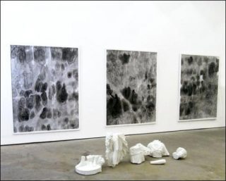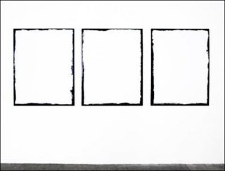 Un triptyque de peintures sera également présenté. Intitulé Hors Cadre 50F, il consiste en trois dessins similaires. Un trait de peinture noire, imprécis, parcourt la bordure de chaque toile. Il fonctionne comme la délimitation d’un espace: la plus grande surface centrale de la peinture reste blanche, comme en attente.