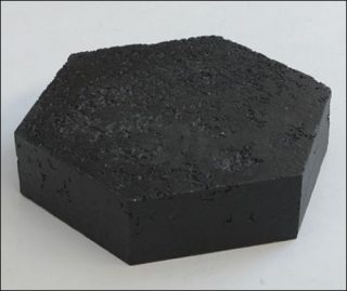 — Simon Boudvin, Asphalte, 2010. Goudron – extrait de l’extrémité d’une route hexagone de 40 cm. Production atelier des Arques