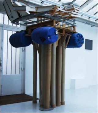 Quant aux constructions de Roman Pellas, mi-hasardeuse mi-planifiées, réalisées à partir d’éléments de récupération (bois, cornières métallique, tubes en corton, bidons en plastiques), elles font parfaitement écho aux sculptures de Simon Boudvin qui s’intéresse à une réalité quotidienne hors d’usage avec une valeur économique réduite à néant.