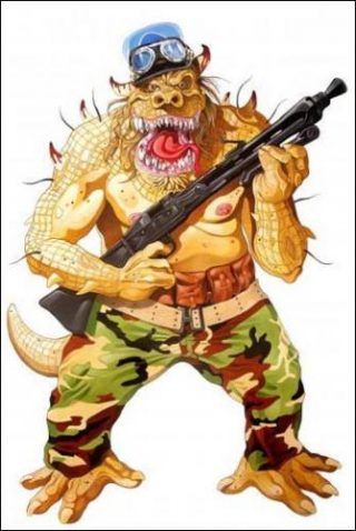 Ce sont les peintures de Kosta Kulundzic qui semblent avoir donné son titre à l’exposition. Sensible au caractère conflictuel et guerrier des religions, il traite le thème de Saint Georges avec dérision, en lui donnant des airs de mercenaire plus que d’icône religieuse. Avec son fusil d’assaut, son attirail militaire, et son expression exagérément survoltée, ce Saint Georges semble sorti d’un film de guerre américain. La série des tableaux décline les stéréotypes du courage et de la virilité, véhiculés dans l’imaginaire et la propagande militaires américains du XXe siècle.