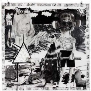 Dans Garance et Baptiste, la petite fille blonde avec sa robe à l’imprimé «petits cÅ“urs» est un personnage sadique, caractéristique du cynisme de cette peinture. L’innocence enfantine est refusée, et insinuée la violence et la perversité de la nature humaine. Les personnages portent des armes; ici et là sont parsemés des membres mutilés. Le dessin imite le gribouillage enfantin, au service de l’expression d’un système primaire et brutal.