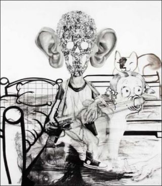 — Jérôme Zonder, Garance et Baptiste, 2008. Encre de chine, fusain, mine de plomb, acrylique, 200 x 200 cm