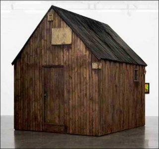 — Robert Kusmirowski, Unacabine, 2008. Planches de bois, papier goudronné, bois contre-plaqué, tuyau en étain, huile acrylique. 398 x 322 x 355 cm.