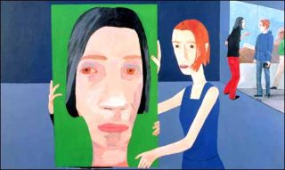 De John Currin, qui superpose sur une même toile les genres et les styles les plus éculés, pour des sujets d’un mauvais goût accompli (tels que des portraits de quinquagénaires béates et débordantes d’une candeur offerte) à Peter Doigt, dont les paysages, et les scènes de genre, tout droit sortis des albums de vacances, dégoulinent de tous les effets de matière prisés par les peintres du dimanche, l’exposition semble dérouler toutes les modalités disponibles pour accorder le recyclage (par appropriation, citation, vampirisation) des images, de toute provenance, avec celui de l’histoire de la peinture et de l’illustration.