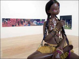 Après quatre ans d’absence Chiho Aoshima expose à nouveau à la galerie Perrotin. Son style et ses préoccupations sont toujours les mêmes. Entre temps la jeune artiste japonaise de trente ans a profité de l’engouement généré par Murakami. Elle a multiplié les expositions personnelles à travers le monde. Fruit de l’incubateur Kaikai Kiki, elle vole de ses propres ailes tout en continuant à travailler pour le maître du néo pop manga. C’est elle entre autre qui numérise les dessins de Murakami et qui élabore les peintures préparatoires. Son rôle est aussi important que minutieux. Cette compétence se retrouve évidemment dans ses propres créations assistées par ordinateur.