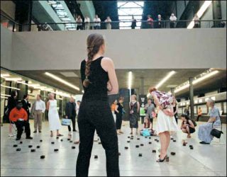Sous la mezzanine, deux contrebasses jouent à leur tour, comme en réponse aux trilles qui se répètent dans l’aigu du piano. Le trio percussif devient un quintette élargi dialoguant à plus de dix mètres de distance. De l’autre côté de la mezzanine, soixante boîtes à musique dispersées à même le sol en cercles inégaux se mettent à jouer. Il faut être tout près d’elles pour percevoir le bruissement que produisent leurs mélodies enchevêtrées.