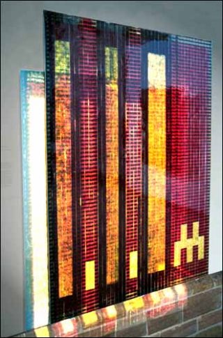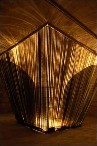 L’image réduite et démultipliée sculpte dans la lumière des formes géométriques, et la colorise. L’ensemble, s’apparentant à une mosaïque, vient se projeter sur le mur, écran de pierre, à quelques centimètres duquel est fixée la plaque. Dissimulée derrière l’œuvre matérielle, l’ombre compose un vitrail coloré, purement virtuel, qui donnerait à voir l’essence même de l’image. Au centre de l’espace, des films tendus depuis le plafond, faisceaux noirs, tracent une structure pyramidale inversée, véritable abri de lumière, devenu le symbole d’une image-temps.