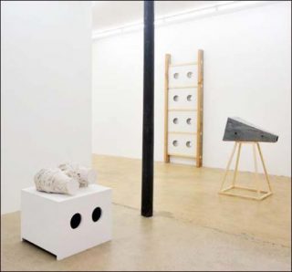 Construire une structure ou plutôt un outil permettant de travailler dans un espace interstitiel. Une série de panneaux en bois est maintenue par des tasseaux insérés entre deux bastaings rainurés. Chaque panneau présente une paire de trous à la face, lesquels sont en vis-à -vis d’autres trous pratiqués dans le mur. L’objet, entre le pilori, la guillotine et la pellicule perforée, induit une pratique aveugle. Les mains chargées de silicone translucide accèdent à l’espace résiduel situé de l’autre côté du mur, une vitrine donnant sur la rue. Le travail se fait dans un espace inaccessible et d’autant plus frustrant qu’il est pratiquement invisible dans le white cube alors qu’il s’affiche pleinement dans l’espace public. Besogne aveugle et amputée d’un côté, mouvements burlesques ou maladresse de zombi de l’autre. La matière est appliquée de sorte à ne jamais sécher, ne jamais devenir un objet.