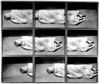 Alors que dans la série «Erste Hängung», les sept tirages font apparaître le corps malmené dans la même position mais dans des environnements à chaque fois différents et des cadres-supports matériellement autonomes, Pitigliano(1982) est conçu comme un tableau et reprend le principe séquentiel d’une construction filmique. Le cadre forme un tout qui se subdivise en une succession de plans, et c’est le geste qui varie. Celui d’une main qui clôt ou presse les yeux d’une morte, et semble vouloir y engouffrer ses doigts.