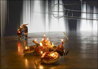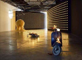Plus loin, la Honda et la Vespa, de Mark Handforth, soulignent à leur tour ce propos. Des bougies de différentes couleurs se consument sur ces engins couchés à terre. Petit à petit, la cire redessine leurs contours. Elle transforme l’image de ces objets recontextualisés dans l’espace d‘exposition. En jouant sur l’équilibre et l’instable, l’artiste propose d’autres visions possibles pour un monde en perpétuelle recomposition.
