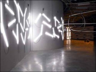 Les sifflets de Lara Favaretto se déroulent de temps à autres sous la pression de l’air comprimé des bouteilles auxquelles ils se raccrochent. Fly Electrocutor, de Fernando Ortega, attend le passage malencontreux d’un insecte pour l’électrocuter et plonger l’espace dans le noir.
