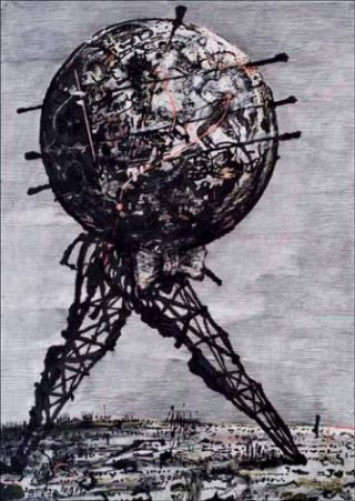 Là est l’intensité de chef-d’Å“uvre de Soleil 24 heures (Le Monde en marche), immense dessin d’un globe porté par deux jambes métalliques en forme de derricks inversés qui s’élancent au-dessus des marais, dans l’infinie variation des courbes à demi effacées qui cernent ce globe, et en font, oui, dans ce pas de géant surchargé et fragile, l’une des plus terrifiantes images de ce monde — l’une des plus délicates aussi. Car si Kentridge ne retranche rien et semble tout épargner, il n’est rien de trop pourtant dans ses Å“uvres, simplement, tout est là , ce qui a été et ce qui est, le lointain et le proche.