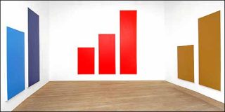 Les œuvres confirment la pertinence du choix d’un tel titre qui écarte la subjectivité, l’interprétation ou l’émotion. Les Nouvelles Peintures de Claude Closky, précisément «sans titre», sont plus que de simples tableaux. Une série de neuf rectangles de couleur (rouge, bleus, noir, griis, bronze) et de hauteur variables, disposés verticalement, se répondent d’un mur à l’autre, sans pour autant se correspondre, s’associer, ne serait-ce que d’un point de vue chromatique. Monochromes, ils évoquent immédiatement les diagrammes utilisés en statistique.
