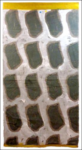 La répétition en pochoir de cette forme abstraite s’applique sur des supports aussi libres que variés, en passant de toiles usagées imprégnées des aléas du temps à , plus récemment, des matières dites «riches» telles que la soie, le velours… C’est à partir des caractères singuliers de ses supports qu’il crée une suite de variation infinie autour d’une seule et même forme qui, de toile en toile, de support en support, est un prétexte à jouer des couleurs, des contrastes et des rythmes.