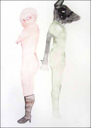 — Femme à bottes et homme à tête de Minotaure, 2007. Aquarelle et encre sur papier. 75 x 120 cm.