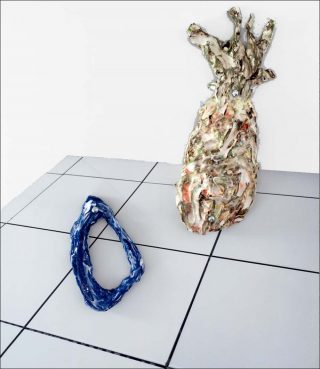 Les œuvres du duo d’artistes suisses, Bastien Aubry et Dimitri Broquard, dessinent une passerelle entre la culture populaire moderne et la tradition ancienne de la céramique en croisant celle-ci avec l’univers du design et notamment l’impression numérique. Chez l’Américaine Lee Maida, la céramique émaillée se mêle au tissu pour créer des bas-reliefs figuratifs. Les contrastes entre les matériaux, leurs textures, leur épaisseur, donne vie à ces tableaux colorés.
