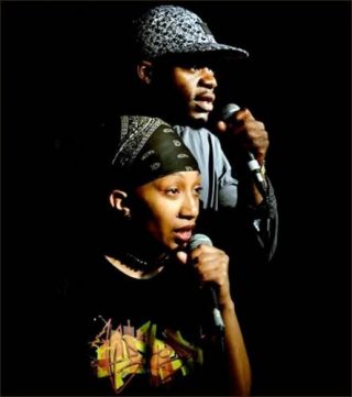 Myriam Baldus et Corneil M’Bombo présentent une performance musicale mêlant slam et beat box.