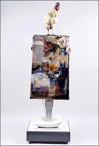 Mais voilà qu’au milieu des années 50, les dripping, champs de couleur et autres zips méditatifs sont battus en brèche par un art peu respectueux des qualités essentielles du médium: le néo-dada autoproclamé Rauschenberg renverse littéralement la perspective. À la surface du tableau devenu socle vertical, autant que support pictural, l’artiste combine les matériaux les plus divers, des objets aussi communs que des cravates, des petites cuillères ou des coupures de journaux. Usagers, récupérés, ils peuvent aussi avoir le charme d’une morbidité toute pittoresque, ainsi des coqs, poules et autres chèvres, empaillés, mités, ébouriffés qui peuplent l’œuvre.