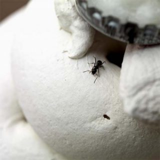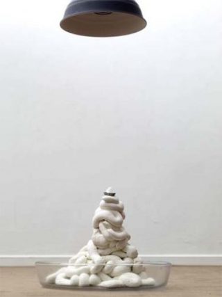 Le sol est le lieu d’un second écosystème. Une fourmilière a pris ses quartiers dans une sculpture en plâtre, fabriquée par l’artiste. Bâtisseur d’univers évolutifs, Michel Blazy aime tenter d’en contrôler les transformations, tout en laissant l’impression paradoxale que les phénomènes se produisent par hasard. Une lumière suspendue au-dessus du dispositif et une nourriture placée à son sommet incitent les fourmis à occuper la surface de la sculpture.