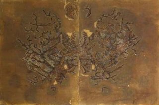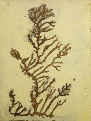 — Branche, 2009. Crème dessert au chocolat et à la vanille, oeufs, lait concentré sucré sur bois grignoté par des souris. 80 x 60 cm.