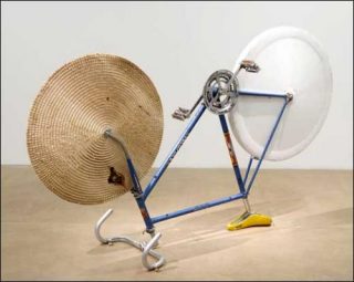 Un autre acte de détournement opère sur un vélo retourné selle et guidon à terre (Of Primitive Means). Le cadre se démembre, s’écartèle, s’étire par endroit. Les roues sont remplacées par des disques de bois et de plâtre, qui n’ont plus en commun avec l’original que la forme circulaire, devenue inutile.