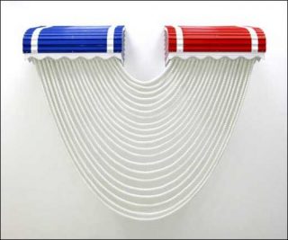 — Michael DeLucia, Community (Red and Blue Awnings), 2009, Aluminium hoods, scallops & wings, ropes. 213,3 x 213,3 x 61 cm