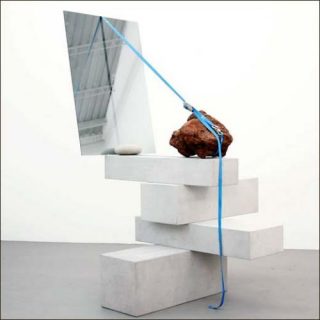 José Dávila utilise des matériaux simples pour réaliser des sculptures d’inspiration architecturale. Celle qui est exposée est constituée de blocs de béton, de pierre, de verre fumé et d’une sangle. La pierre, posée sur les blocs de béton empilés, est tenue en équilibre grâce à la sangle et le panneau de verre vertical. Cette pièce fait appel aux éléments et principes fondamentaux de l’architecture: elle illustre une situation où toutes les forces appliquées à un objet se neutralisent. Chaque élément de la sculpture agit contre l’autre, permettant à l’ensemble de tenir.