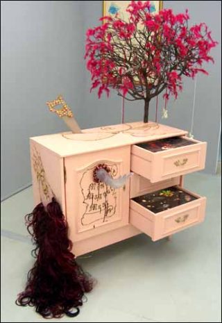 Dans un tout autre registre, le travail de Françoise Quardon rejette lui aussi toute sentimentalité, tout en se réclamant d’une certaine esthétique «glam rock». L’installation/sculpture Miss Magot Meat (2007) combine l’aspect décoratif d’effets baroques (perles, angelots, plumes, couleur rose bonbon) à l’image trash d’une femme découpée en rondelles (mais la scie est perlée…). L’artiste se met en scène dans la photographie Pute en jeune mariée abandonnée sur un banc public, le bouquet toujours à la main, et se fait alors à la fois auteure et illustratrice de son propre mythe.