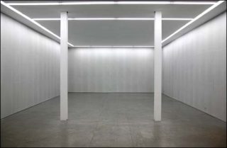 La pièce est éclairée par des néons blancs. La lumière crue qui tombe du plafond baigne l’environnement dans une atmosphère froide. Les lettres qui se dessinent sur les parois se démultiplient sans changer d’aspect. La typographie régulière constitue une trame grisâtre qui perturbe le regard. Des rythmes apparaissent et laissent entrevoir des mouvements ondulatoires.