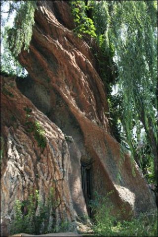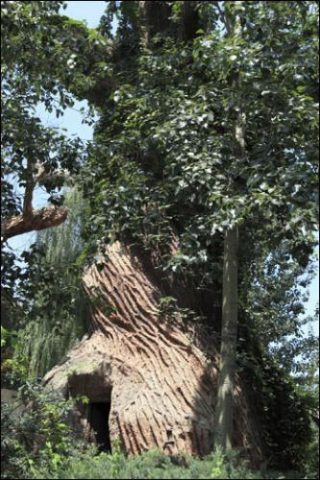 Ainsi, nous pourrions avoir l’impression de nous trouver pratiquement dans une forêt tropicale tant les troncs d’arbres sont impressionnants. Pourtant, quelques indices viennent perturber notre perception. Tantôt on perçoit une portion de bâtiment derrière un arbre, tantôt on trouve une porte incrustée dans un tronc. Un espace entre les racines semble se creuser, semblable à une caverne, ou un bout de grillage se fait également remarquer. Alors, dans quel type d’environnement nous situons-nous finalement? Et face à quoi nous trouvons-nous au juste? Doit-on remettre en question notre première impression, celle d’être face à la nature?