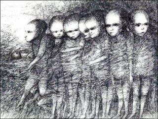 Les sept artistes réunis dans cette exposition, forment une sorte de société secrète où les affinités ne manquent pas. Familiers de l’inconnu et de l’étrange, leurs œuvres sont dans l’entremonde, là où se célèbrent les noces de l’art et de la folie, de la vie et de la mort, où se jouent les multiples passages de l’originaire à la culture, de l’intime à l’universel.