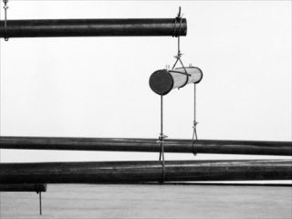 Mais, à vrai dire, l’exposition aura déjà commencé avant d’entrer dans le bâtiment. Dans la prairie un corps mort en béton a été coulé. Un câble d’acier y est attaché qui remonte à l’oblique jusqu’au sommet du phare, il y entre par une fenêtre et redescend verticalement à l’intérieur. Le phare semble ancré dans l’île, nouvel arraisonnement. Tenu par l’île, à travers l’architecture qui la domine, pend un mobile contraint dans ses déplacements, un mobile immobilisé: Modèle pour l’Hospitalité i.e. l’Exclusion.