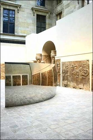 L’immense miroir, conçu par Anish Kapoor pour la cour Khorsabad du palais Mésopotamien, réfléchit cet univers en facettes de la sculpture. Depuis la fin des années 90, l’artiste travaille de l’acier poli: C-curve est un arc de cercle posé au sol, un rectangle incurvé un peu plus haut que la taille humaine. L’image des bas-reliefs monumentaux se mêle à celle des spectateurs. La surface intérieure du miroir reproduit le mécanisme de la vision sur la pupille: le reflet se projette à l’envers jusqu’à une certaine distance, puis se retourne à l’endroit quand on s’approche de la paroi. La déformation de l’espace se résorbe progressivement, et l’appréhension du mouvement dans l’espace prend une dimension vertigineuse.