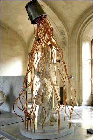 — Douce douche, 2007. Bassine métallique. Tubes de cuivre. Boules de pétanque. Fragments de marbre. 220 x 100 x 80cm. Collection de l’artiste.