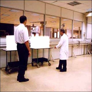 Dans des contextes high tech d’usines ultramodernes, des photographies de format identique (60 x 60 cm) présentent un visiteur bien habillé qui semble contrôler, aux côtés d’un ouvrier spécialisé ou de quelque technicien appliqué, la qualité d’un produit qui diffuse chaque fois une faible lumière. Photographies au glacis régulier apparemment tout droit extraites d’un catalogue commercial, sinon de documents internes, discrètement propagandistes, d’une grande firme industrielle — en l’espèce, Ouest-Lumière.
