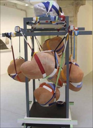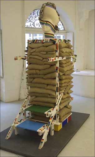 Françoise Vergier confronte les matières et les formes, et du chaos fait naître l’harmonie. La géométrie des portiques colorés côtoie la rondeur immaculée des têtes en terre cuite émaillée sur lesquelles sont accrochées des breloques en métal et en verre.