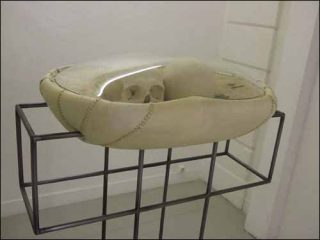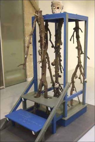 — Sel des parents, 1995. Socle, structure métallique, bois de tilleul, parchemin, crânes, terre, verre bombé.
