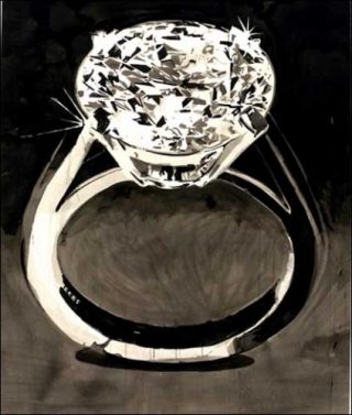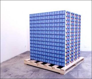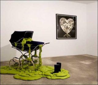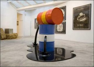 Un bidon de pétrole se déverse de son contenu, un empilement de boîtes de Kleenex nous promet hygiène et santé, un réfrigérateur conserve des dépôts de sperme, et une série de dessins méticuleusement réalisés nous vante la valeur des diamants avec l’esthétique des réclames publicitaires des années 70.