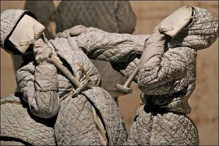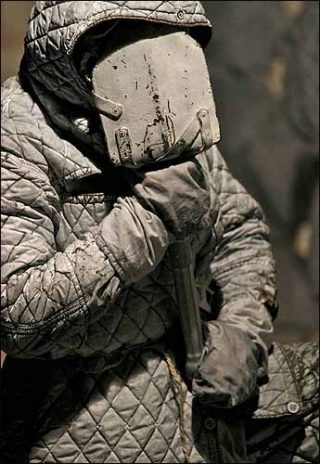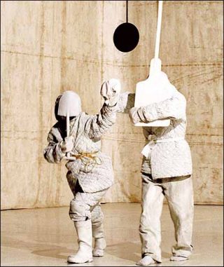 De leur côté, tenant devant leur visage la pelle qui pourrait servir à creuser leur propre tombe, les habitants de cette planète stérile ne sont pas dénués d’une humanité rieuse. Dans une veine burlesque, ils courent, chutent, se perdent, se cognent les uns ou autres, enfantins ou tendres dans leur tentative de rapprochement deux à deux. Quand l’un d’entre eux prend la parole, et s’érige en Dictateur improvisé à renfort de lettres martelées, « T A T E T T », le rire se mêle au sinistre, convoquant les souvenirs de l’histoire et les égarements politiques actuels. Car ce futur archaïque n’est autre que notre présent, métaphore d’un temps frileux, inquiet, que les pessimistes (scientifiques, économistes) vouent déjà à sa perte. Et malgré tout ce que l’on peut penser, Régine Chopinot ne semble pas être de ceux là … Gardons en mémoire que le vide existe aussi dans sa version concentrée, à la manière des trous noirs, ouvrant sur un néant transitionnel, une temporalité autre, peut-être porteuse de renouveau.