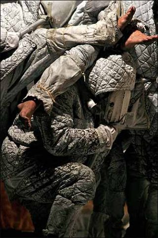 Etrange univers, en tout cas, que celui de Régine Chopinot et sa petite communauté de danseurs, dont les corps, dissimulés sous une combinaison sans couleur, sont privés de sexe et de visage. Regroupés en une masse informe et anonyme, amalgamés les uns aux autres comme pour se protéger d’un danger indéterminé mais omniprésent, ils se mobilisent en un mouvement lent, précautionneux, improductif — va et vient incessant, d’avant en arrière, d’amplitude croissante. Economes, nécessitant une dépense d’énergie minimale, les déplacements de la troupe font penser à ces organismes unicellulaires, protozoaires et autres levures, chez qui une seule cellule accomplit toutes les fonctions vitales : digestion, excrétion, excitation, reproduction, garantissant la survie dans des conditions les plus difficiles. Parfois brisée par une course solitaire, cette respiration régulière des êtres ensemble rythme l’espace et prouve, si infime et ridicule soit-elle, la permanence du vivant.