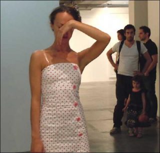 Les seuls à flâner dans cette «performance déambulatoire» sont les spectateurs. En effet, les acteurs ont été répartis dans des coins et recoins de la galerie, où ils font sagement ce qu’ils ont à faire, sans sortir de leur case. Certains sont impassibles, silencieux, immobiles, et même couchés. D’autres hurlent gentiment et cabotinent comme les comédiens du théâtre métaphysique des années soixante. Les soliloques de l’un troublent le mutisme de l’autre. Un couple artistique joue aux jeunes mariés en se tenant par le bras. Dans la pièce du fond, en léger contrebas, un jeune homme dénudé, le caleçon bien maintenu par une ceinture en forme de cartouchière, passe son temps à se coller des bonbons acidulés sur tout le corps, comme s’il s’agissait de sangsues multicolores. Cette action, intitulée Collection de salives, est sans doute la prestation la plus spectaculaire de la soirée.
