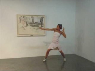 Elle a aussi participé à l’événement. Elle a dansé. En baskets, comme il se doit. Dans un style qui n’appartient qu’à elle, léger, nerveux, rock, gracieux et faussement insouciant. Détachée ou presque. Tenant compte tout de même du cadre — des dessins figuratifs accrochés aux cimaises, notamment de celui qui lui a inspiré la jolie robe moulante à pois rouges dont elle est parée — mais aussi du public de voyeurs-chalands, parfois impatients, souvent inattentifs, dissipés, toujours difficiles à captiver. La clientèle a donc fait le tour des stands de cette brocante d’art. Le va et le vient.
