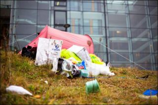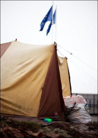 Chaque année, cette institution publique est une instance de recours pour des dizaines de milliers de citoyens. Certains d’entre eux campent d’ailleurs juste à côté, dans des abris de fortune. Protestant, attendant, délirant parfois, ils vivent là sous le ciel gris de novembre. Migrants sans papiers, citoyens en colère ou fous, chacun porte son histoire propre, qu’il tente de me confier dans une langue que je ne comprends pas. Leur présence en ces lieux devient pour moi l’expression générale d’un désenchantement, d’une indignation. Leur histoire commune est celle des déshérités de l’Europe, des laissés-pour-compte de cette économie globale que l’on nous fait miroiter comme miroitent les drapeaux dans les vitres. Dernière journée à Strasbourg. Les reflets du soleil sur les parois vitrées de l’Agora me renvoient un jour inversé qui ressemble à la nuit. Je le photographie.»