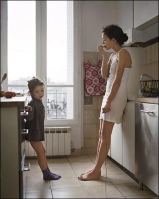 Mais surtout, la réflexion sur l’autoportrait se double ici de la présence de l’enfant. L’image de soi se trouve ainsi redistribuée, les postures s’assemblent, se répondent, divergent. Le temps est l’élément central de la série: les jours passent, leur effet est presque imperceptible, l’image toujours au présent.