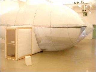 La grande salle, quant à elle, est occupée, remplie pour ainsi dire, d’un coussin géant gonflé d’air. Les deux pièces assemblées bord à bord, qui le composent, sont en plastique transparent, pour celle du dessous, et de lin opaque, pour celle du dessus. Un sas de bois bricolé permet de pénétrer à l’intérieur de l’œuvre.