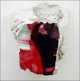 Métamorphosant la petite galerie du sous-sol en une crypte profane, des blocs grossièrement taillés jaillissent des murs, tels les restes d’une fresque disparue. Il ne faut pourtant pas s’y tromper : ici, pas de nostalgie, ni de retour à un quelconque ordre antique, mais, plutôt une tentative de déstabilisation du regard.
