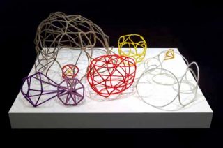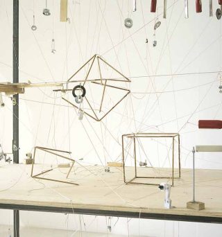 — Sans titre (1 tétraèdre + 1 cube + 1 octaèdre = 1 dodécaèdre), 2000. Batônnets de bois, fils, cadre métallique, moteur électrique. H : 180 cm x L : 110 cm x P : 80 cm.