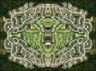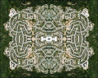 La série des photographies «Symmetric settlements» a été réalisée en manipulant des images satellite de lotissements américains. Les vues aériennes sont dupliquées, créant un motif parfaitement symétrique qui rappelle le jardin baroque à la française, les dessins des mandalas ou encore les tests de Rorschach. Clay Ketter avoue apprécier la beauté de ces formes, observant avec tendresse le désir fou de perfection et de sécurité qu’elles sous-tendent.